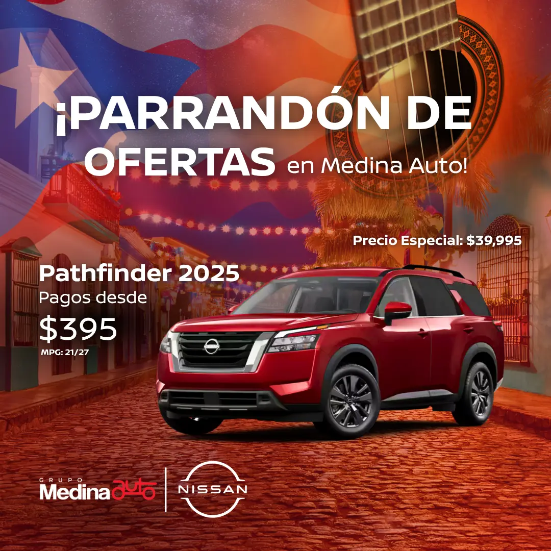 Nissan Pathfinder 2025 – Modelo PA-2500. Precio Especial: $39,995.00 con pronto de $14,000.00. Balance financiado $25,995.00. Pago estimado de $395 a 84 meses al 6.99% APR con +750 FICO Score, a través de Popular Auto.