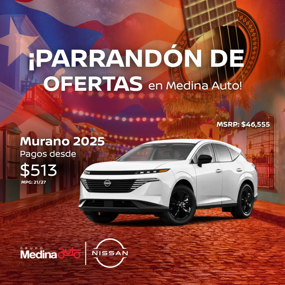 Nissan Murano 2025 – Modelo MU-2500. MSRP: $46,555.00 con pronto de $12,500.00. Balance financiado $34,055.00. Pago estimado de $513 a 84 meses al 6.99% APR con +750 FICO Score, a través de Popular Auto.