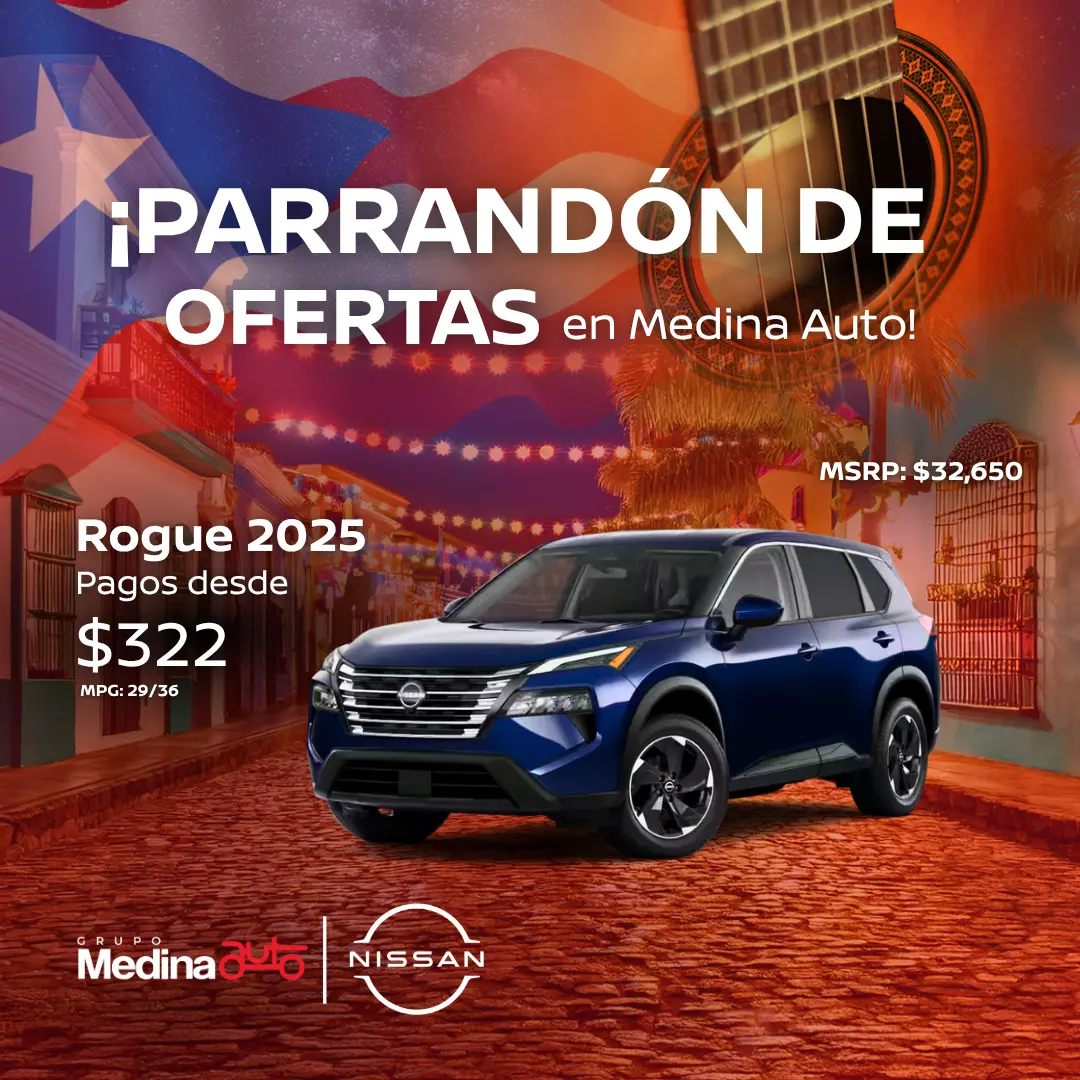 Nissan Rogue 2025 – Modelo RO-2504. MSRP: $32,650.00 con pronto de $11,000.00. Balance financiado $21,650.00. Pago estimado de $322 a 84 meses al 6.99% APR con +750 FICO Score, a través de Popular Auto.
